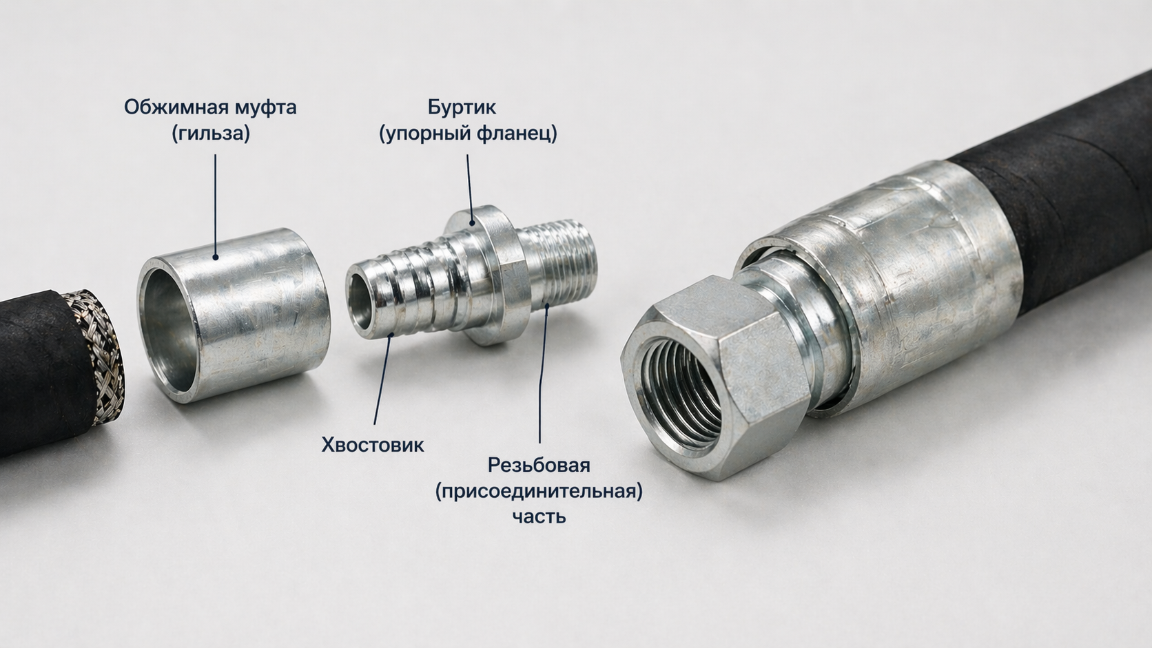 Резьбовая или присоединительная часть — выходит наружу после обжима и служит для подключения рукава к системе. Именно здесь располагается резьба (метрическая, BSP, JIC и другие стандарты) или конусное уплотнение.