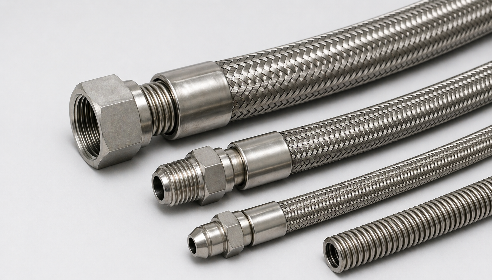 Концевые фитинги. На концах металлического РВД — фитинги из нержавеющей или углеродистой стали. Способ подключения: накидная гайка, конус (JIC, DIN), фланец или сварной торец. Фитинги приварены к гофре аргонодуговой сваркой, что обеспечивает герметичность даже при высоком давлении.