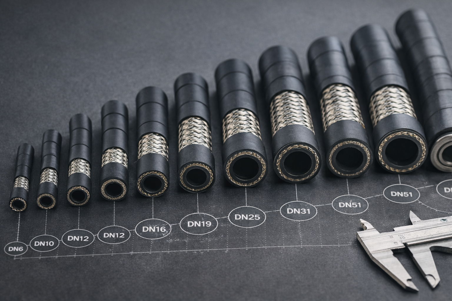 Диаметры РВД DN (Diameter Nominal) точно соответствуют внутреннему диаметру рукава в миллиметрах и являются ключевым параметром гидравлической системы. Диаметр РВД DN19 обеспечивает расход 28-45 л/мин при скорости 4-6 м/с, диаметр РВД DN51 - до 180 л/мин в промышленных системах.